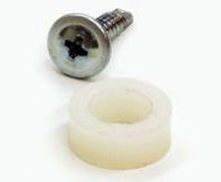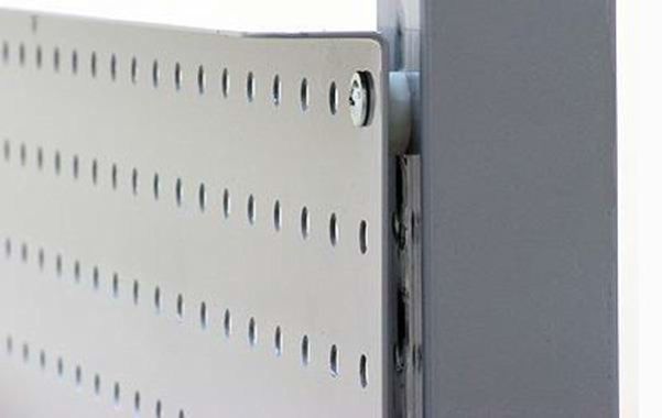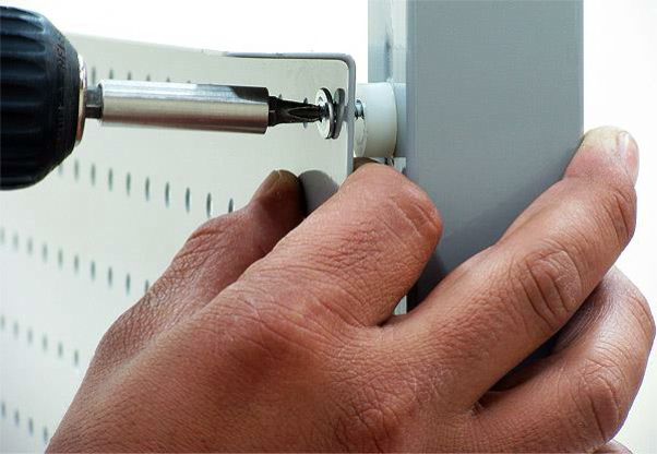 1. Place the pegboard on back of the uprights. The screws are self-drilling and self-tapping. Place a screw in the hole at the front and the plastic washer back of the pegboard. To install the screws, use a drill with a screwdriver bit. The screw will drill its hole and tap itself in with the rotation of the drill.