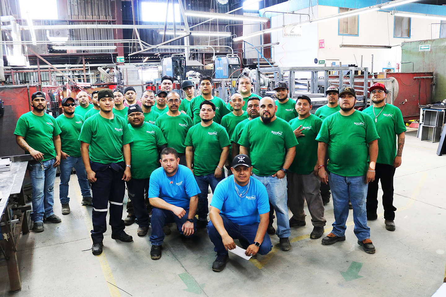 We weld the legs and skirt of each bench to make it stronger, and reduce the customer’s assembly labor. These 26 men weld all the seams, instead of having the user screw them together.